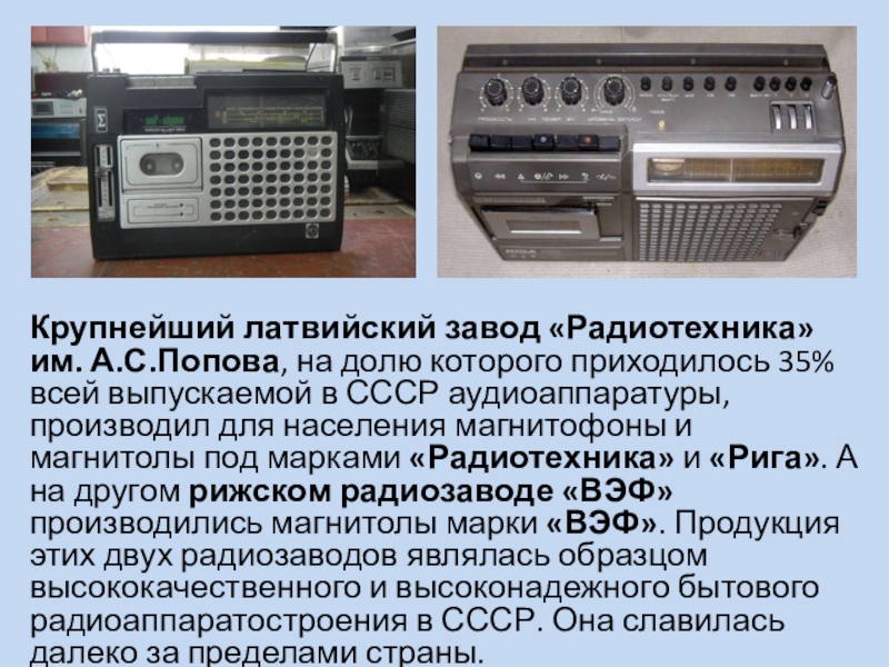 А.С.Попова, на долю которого приходилось 35% всей выпускаемой в СССР аудиоаппаратуры, производил для населения магнитофоны и магнитолы под марками «Радиотехника» и «Рига». А на другом рижском радиозаводе «ВЭФ» производились магнитолы марки «ВЭФ». Продукция этих двух радиозаводов являлась образцом высококачественного и высоконадежного бытового радиоаппаратостроения в СССР. Она славилась далеко за пределами страны.
