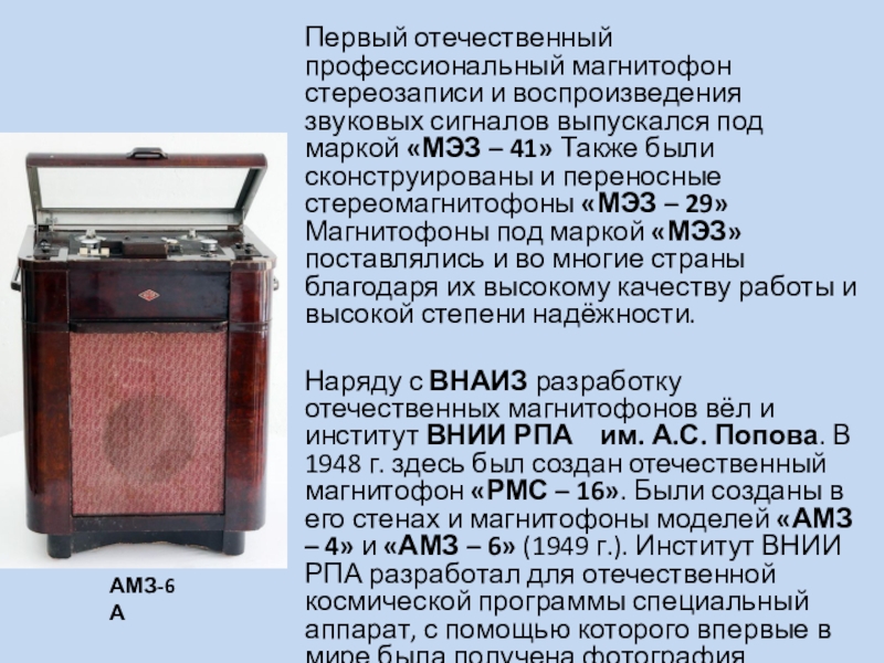 Наряду с ВНАИЗ разработку отечественных магнитофонов вёл и институт ВНИИ РПА им. А.С. Попова. В 1948 г. здесь был создан отечественный магнитофон «РМС – 16». Были созданы в его стенах и магнитофоны моделей «АМЗ – 4» и «АМЗ – 6» (1949 г.). Институт ВНИИ РПА разработал для отечественной космической программы специальный аппарат, с помощью которого впервые в мире была получена фотография обратной стороны Луны.