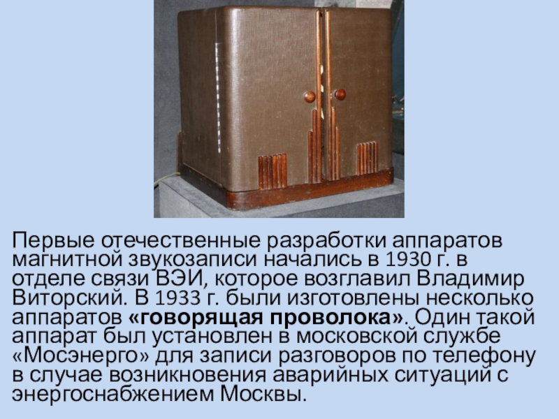 отделе связи ВЭИ, которое возглавил Владимир Виторский. В 1933 г. были изготовлены несколько аппаратов «говорящая проволока». Один такой аппарат был установлен в московской службе «Мосэнерго» для записи разговоров по телефону в случае возникновения аварийных ситуаций с энергоснабжением Москвы.