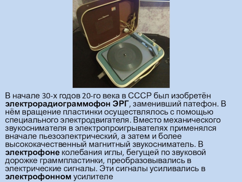 Слайд 4В начале 30-х годов 20-го века в СССР был изобретён электрорадиограммофон