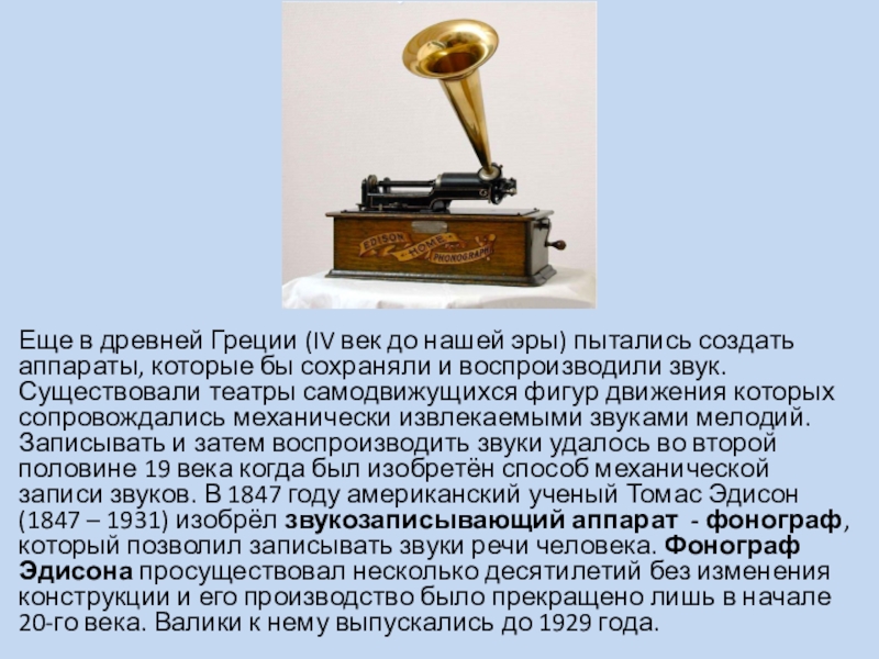 аппараты, которые бы сохраняли и воспроизводили звук. Существовали театры самодвижущихся фигур движения которых сопровождались механически извлекаемыми звуками мелодий. Записывать и затем воспроизводить звуки удалось во второй половине 19 века когда был изобретён способ механической записи звуков. В 1847 году американский ученый Томас Эдисон (1847 – 1931) изобрёл звукозаписывающий аппарат - фонограф, который позволил записывать звуки речи человека. Фонограф Эдисона просуществовал несколько десятилетий без изменения конструкции и его производство было прекращено лишь в начале 20-го века. Валики к нему выпускались до 1929 года.