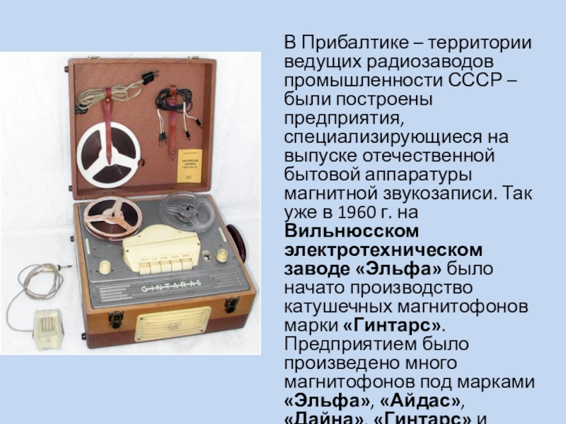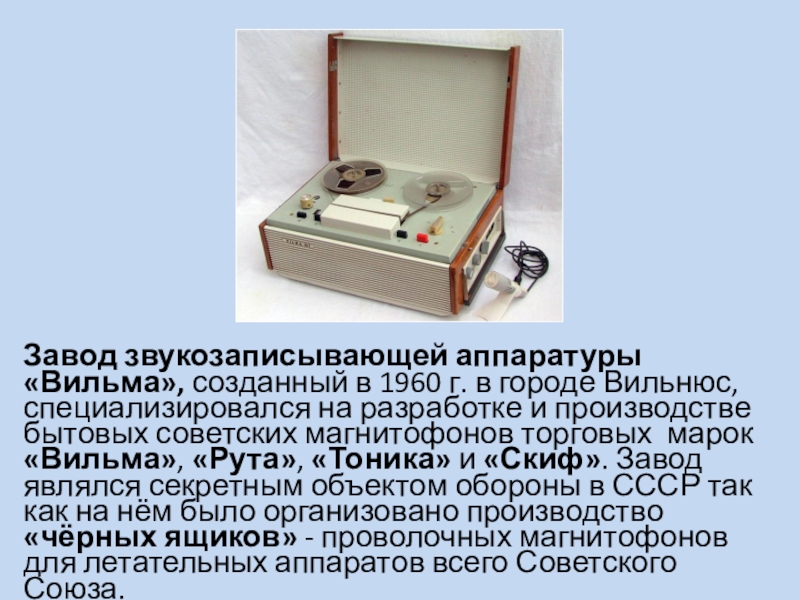 Слайд 23Завод звукозаписывающей аппаратуры «Вильма», созданный в 1960 г. в городе Вильнюс,
