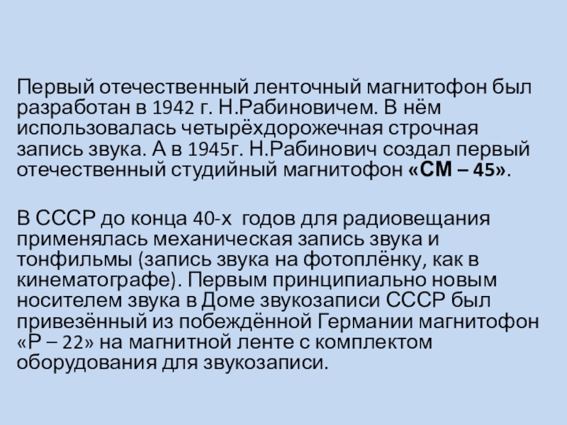 нём использовалась четырёхдорожечная строчная запись звука. А в 1945г. Н.Рабинович создал первый отечественный студийный магнитофон «СМ – 45».