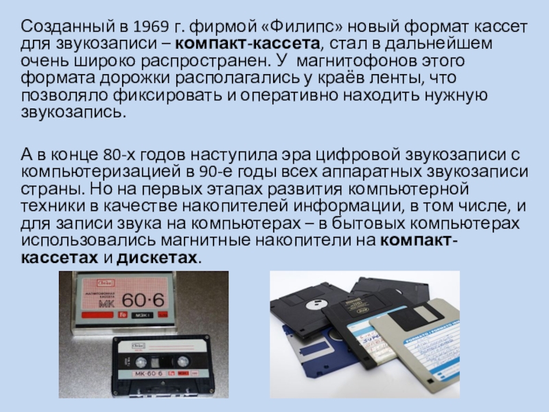 Слайд 25Созданный в 1969 г. фирмой «Филипс» новый формат кассет для звукозаписи