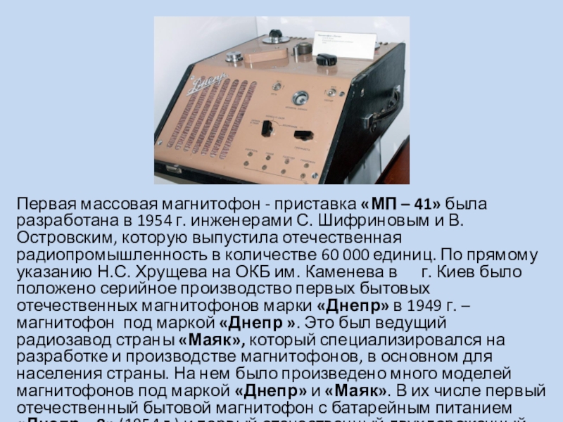 1954 г. инженерами С. Шифриновым и В. Островским, которую выпустила отечественная радиопромышленность в количестве 60 000 единиц. По прямому указанию Н.С. Хрущева на ОКБ им. Каменева в г. Киев было положено серийное производство первых бытовых отечественных магнитофонов марки «Днепр» в 1949 г. – магнитофон под маркой «Днепр ». Это был ведущий радиозавод страны «Маяк», который специализировался на разработке и производстве магнитофонов, в основном для населения страны. На нем было произведено много моделей магнитофонов под маркой «Днепр» и «Маяк». В их числе первый отечественный бытовой магнитофон с батарейным питанием «Днепр – 8» (1954 г.) и первый отечественный двухдорожечный магнитофон «Днепр – 9» выпущенный в 1956 г.