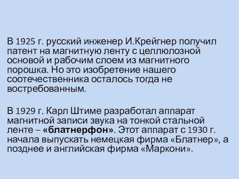 Слайд 6В 1925 г. русский инженер И.Крейгнер получил патент на магнитную ленту