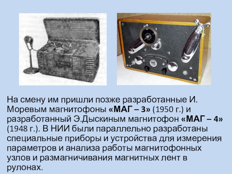 Слайд 11На смену им пришли позже разработанные И.Моревым магнитофоны «МАГ – 3»