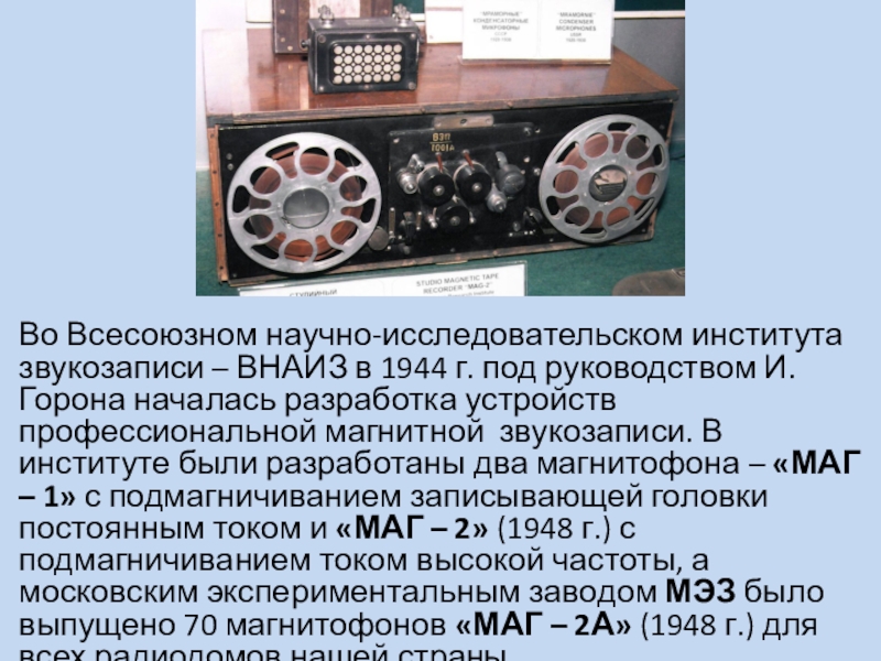 руководством И.Горона началась разработка устройств профессиональной магнитной звукозаписи. В институте были разработаны два магнитофона – «МАГ – 1» с подмагничиванием записывающей головки постоянным током и «МАГ – 2» (1948 г.) с подмагничиванием током высокой частоты, а московским экспериментальным заводом МЭЗ было выпущено 70 магнитофонов «МАГ – 2А» (1948 г.) для всех радиодомов нашей страны.