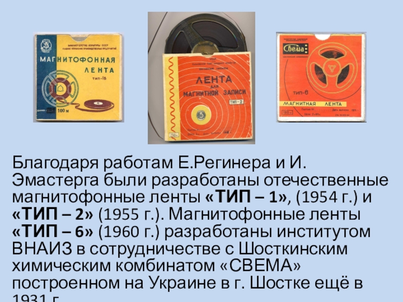 Слайд 12Благодаря работам Е.Регинера и И.Эмастерга были разработаны отечественные магнитофонные ленты «ТИП