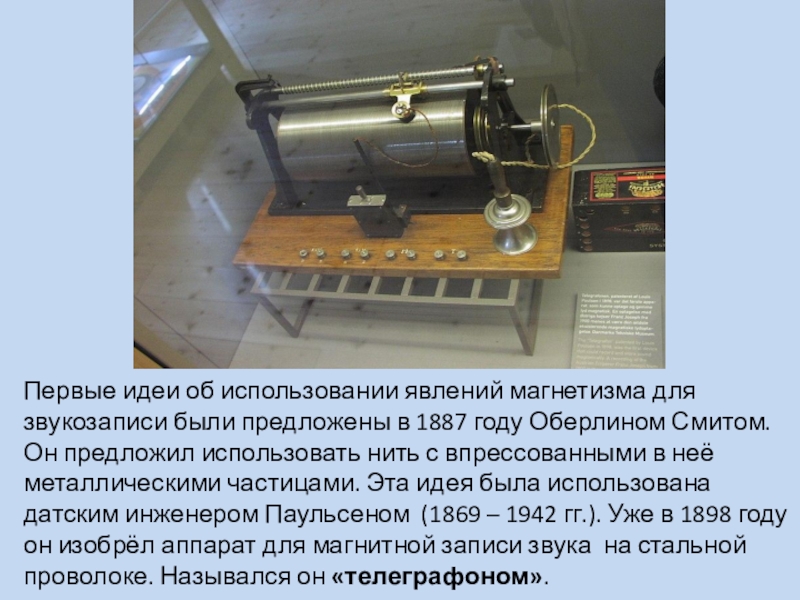 1887 году Оберлином Смитом. Он предложил использовать нить с впрессованными в неё металлическими частицами. Эта идея была использована датским инженером Паульсеном (1869 – 1942 гг.). Уже в 1898 году он изобрёл аппарат для магнитной записи звука на стальной проволоке. Назывался он «телеграфоном».