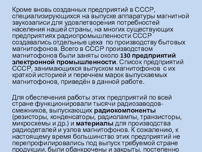 Слайд 26Кроме вновь созданных предприятий в СССР, специализирующихся на выпуске аппаратуры магнитной