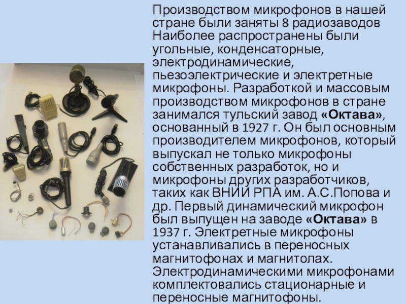 были угольные, конденсаторные, электродинамические, пьезоэлектрические и электретные микрофоны. Разработкой и массовым производством микрофонов в стране занимался тульский завод «Октава», основанный в 1927 г. Он был основным производителем микрофонов, который выпускал не только микрофоны собственных разработок, но и микрофоны других разработчиков, таких как ВНИИ РПА им. А.С.Попова и др. Первый динамический микрофон был выпущен на заводе «Октава» в 1937 г. Электретные микрофоны устанавливались в переносных магнитофонах и магнитолах. Электродинамическими микрофонами комплектовались стационарные и переносные магнитофоны.