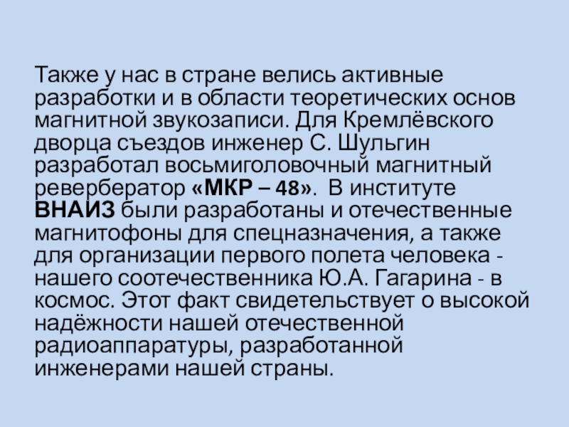 теоретических основ магнитной звукозаписи. Для Кремлёвского дворца съездов инженер С. Шульгин разработал восьмиголовочный магнитный ревербератор «МКР – 48». В институте ВНАИЗ были разработаны и отечественные магнитофоны для спецназначения, а также для организации первого полета человека - нашего соотечественника Ю.А. Гагарина - в космос. Этот факт свидетельствует о высокой надёжности нашей отечественной радиоаппаратуры, разработанной инженерами нашей страны.