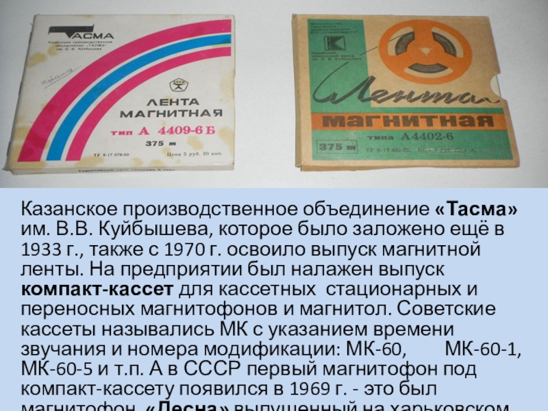 в 1933 г., также с 1970 г. освоило выпуск магнитной ленты. На предприятии был налажен выпуск компакт-кассет для кассетных стационарных и переносных магнитофонов и магнитол. Советские кассеты назывались МК с указанием времени звучания и номера модификации: МК-60, МК-60-1, МК-60-5 и т.п. А в СССР первый магнитофон под компакт-кассету появился в 1969 г. - это был магнитофон «Десна» выпущенный на харьковском заводе «Протон».