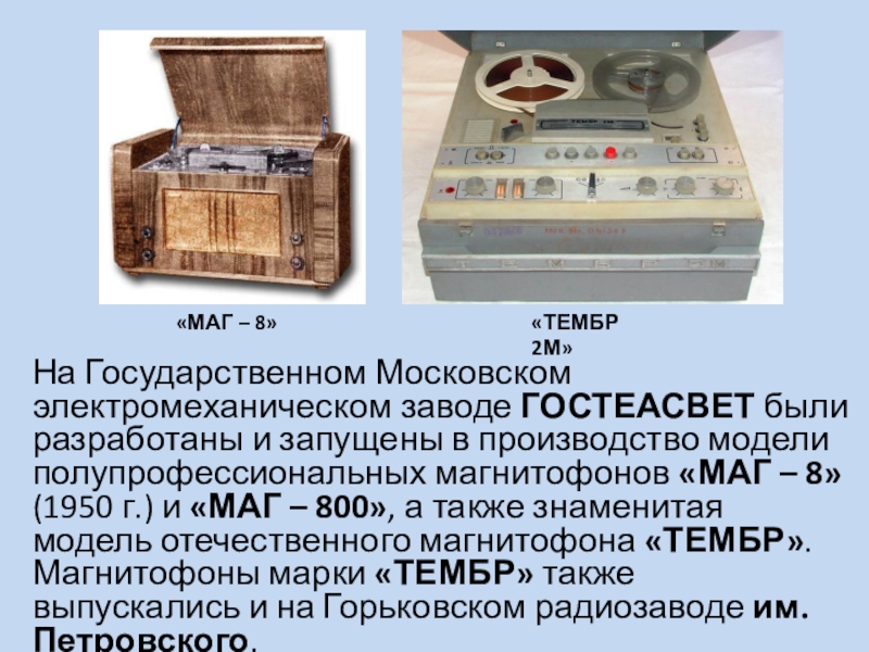 производство модели полупрофессиональных магнитофонов «МАГ – 8» (1950 г.) и «МАГ – 800», а также знаменитая модель отечественного магнитофона «ТЕМБР». Магнитофоны марки «ТЕМБР» также выпускались и на Горьковском радиозаводе им. Петровского.