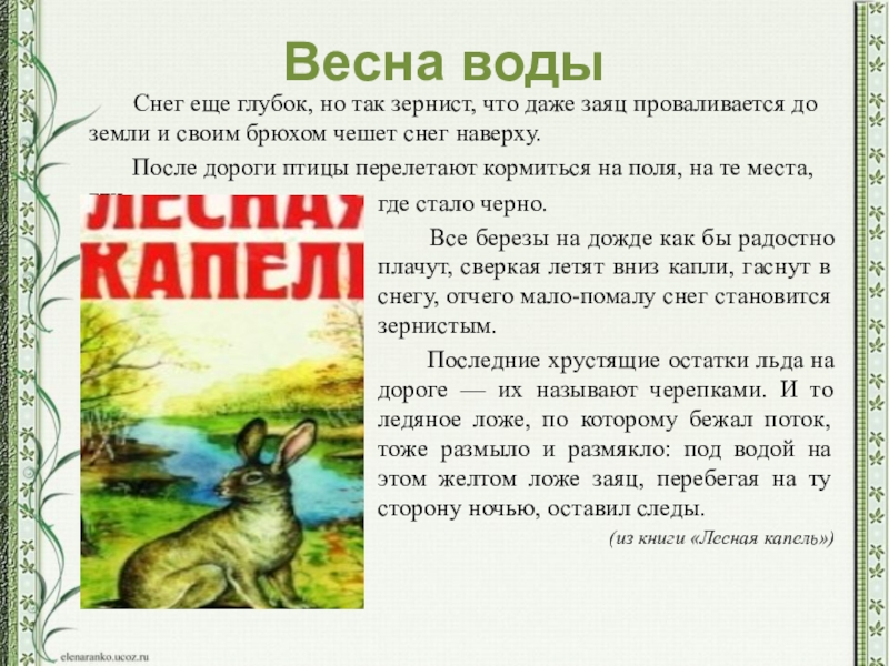 Последние хрустящие остатки льда на дороге — их называют черепками. И то ледяное ложе, по которому бежал поток, тоже размыло и размякло: под водой на этом желтом ложе заяц, перебегая на ту сторону ночью, оставил следы.