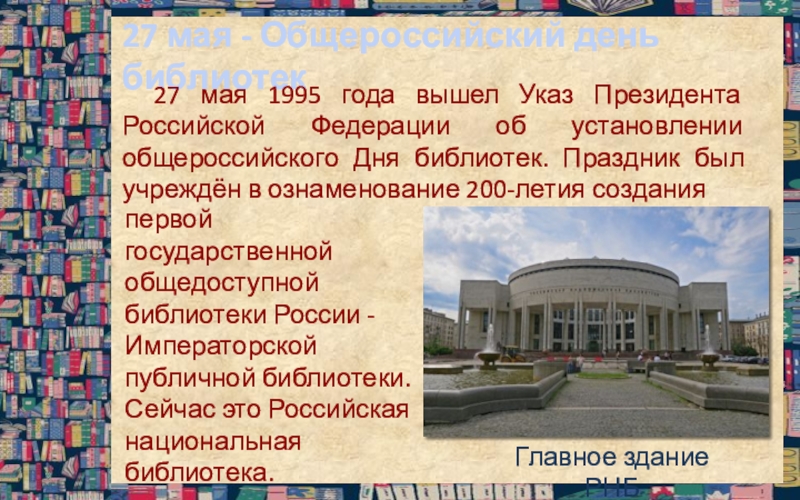 первой государственной общедоступной библиотеки России - Императорской публичной библиотеки. Сейчас это Российская национальная библиотека.