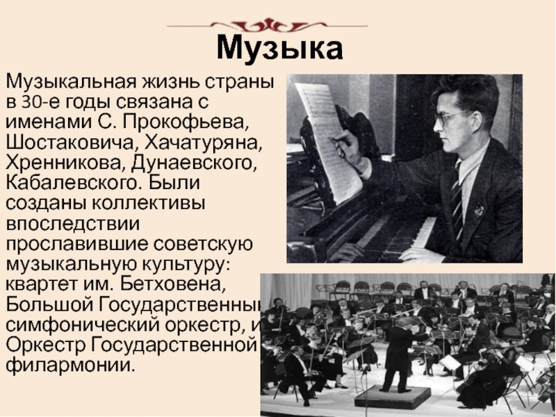 Музыкальная жизнь страны в 30-е годы связана с именами С. Прокофьева,
