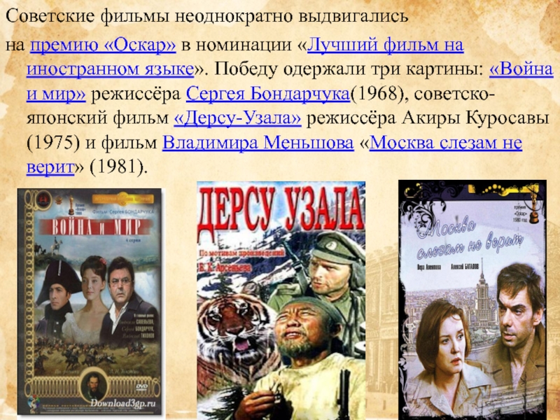 языке». Победу одержали три картины: «Война и мир» режиссёра Сергея Бондарчука(1968), советско-японский фильм «Дерсу-Узала» режиссёра Акиры Куросавы (1975) и фильм Владимира Меньшова «Москва слезам не верит» (1981).