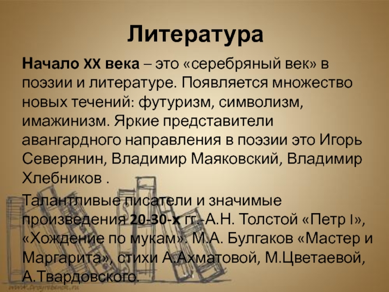 Талантливые писатели и значимые произведения 20-30-х гг.-А.Н. Толстой «Петр I», «Хождение по мукам». М.А. Булгаков «Мастер и Маргарита», стихи А.Ахматовой, М.Цветаевой, А.Твардовского.