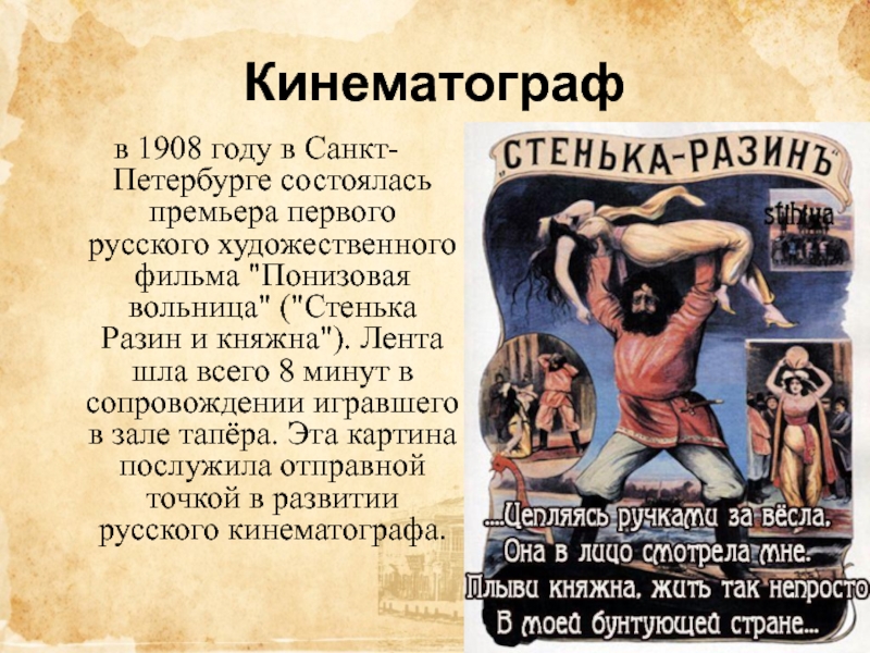 фильма "Понизовая вольница" ("Стенька Разин и княжна"). Лента шла всего 8 минут в сопровождении игравшего в зале тапёра. Эта картина послужила отправной точкой в развитии русского кинематографа.