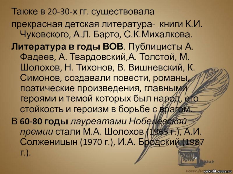 В 60-80 годы лауреатами Нобелевской премии стали М.А. Шолохов (1965 г.), А.И. Солженицын (1970 г.), И.А. Бродский (1987 г.).