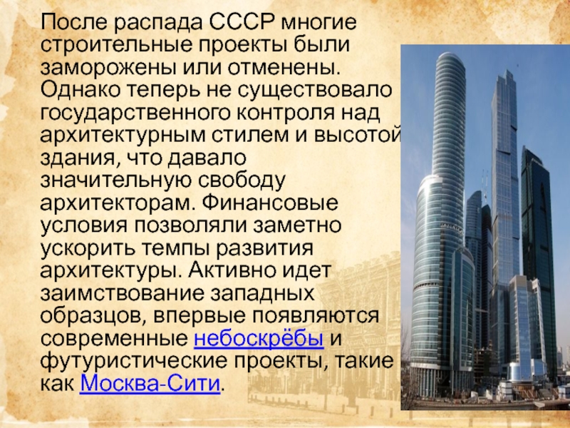 отменены. Однако теперь не существовало государственного контроля над архитектурным стилем и высотой здания, что давало значительную свободу архитекторам. Финансовые условия позволяли заметно ускорить темпы развития архитектуры. Активно идет заимствование западных образцов, впервые появляются современные небоскрёбы и футуристические проекты, такие как Москва-Сити.