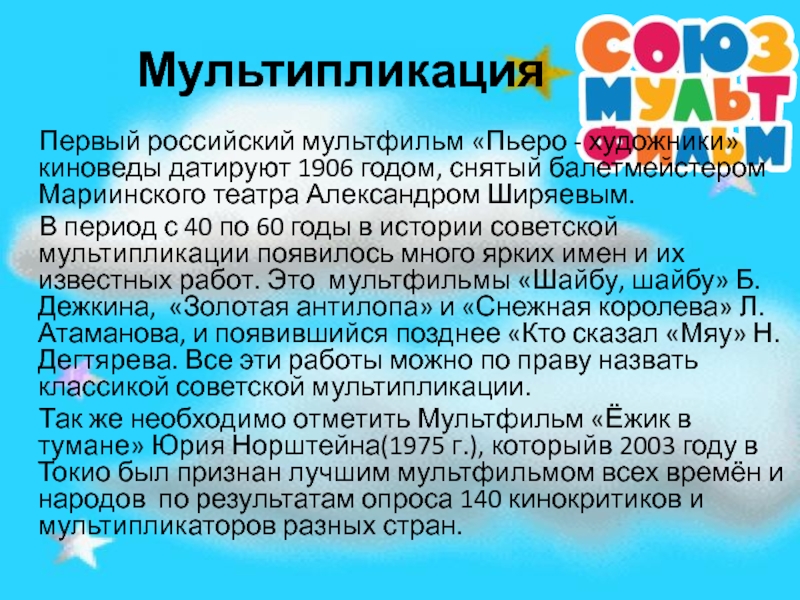 Так же необходимо отметить Мультфильм «Ёжик в тумане» Юрия Норштейна(1975 г.), которыйв 2003 году в Токио был признан лучшим мультфильмом всех времён и народов по результатам опроса 140 кинокритиков и мультипликаторов разных стран.