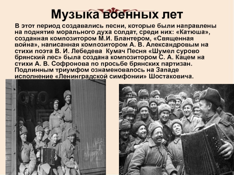 были направлены на поднятие морального духа солдат, среди них: «Катюша», созданная композитором М.И. Блантером, «Священная война», написанная композитором А. В. Александровым на стихи поэта В. И. Лебедева Кумач Песня «Шумел сурово брянский лес» была создана композитором С. А. Кацем на стихи А. В. Софронова по просьбе брянских партизан. Подлинным триумфом ознаменовалось на Западе исполнение «Ленинградской симфонии» Шостаковича.