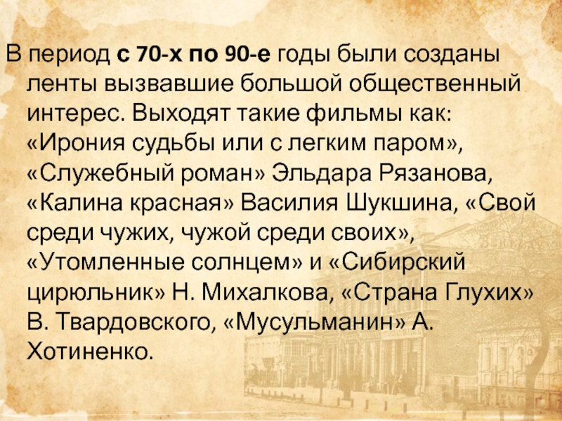большой общественный интерес. Выходят такие фильмы как: «Ирония судьбы или с легким паром», «Служебный роман» Эльдара Рязанова, «Калина красная» Василия Шукшина, «Свой среди чужих, чужой среди своих»,«Утомленные солнцем» и «Сибирский цирюльник» Н. Михалкова, «Страна Глухих» В. Твардовского, «Мусульманин» А. Хотиненко.