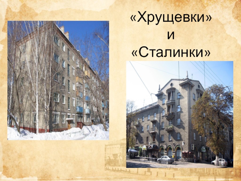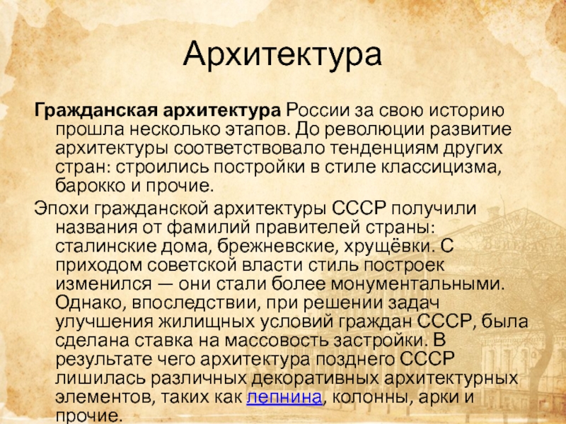 Эпохи гражданской архитектуры СССР получили названия от фамилий правителей страны: сталинские дома, брежневские, хрущёвки. С приходом советской власти стиль построек изменился — они стали более монументальными. Однако, впоследствии, при решении задач улучшения жилищных условий граждан СССР, была сделана ставка на массовость застройки. В результате чего архитектура позднего СССР лишилась различных декоративных архитектурных элементов, таких как лепнина, колонны, арки и прочие.