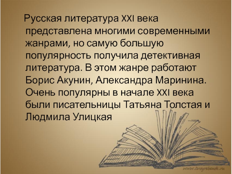 Слайд 5 Русская литература XXI века представлена многими современными жанрами, но