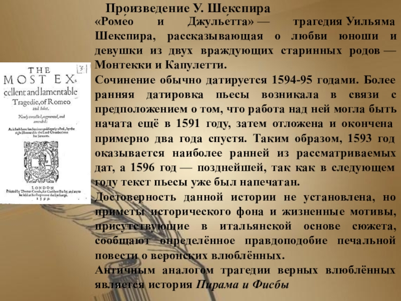 «Роме́о и Джулье́тта» — трагедия Уильяма Шекспира, рассказывающая о любви