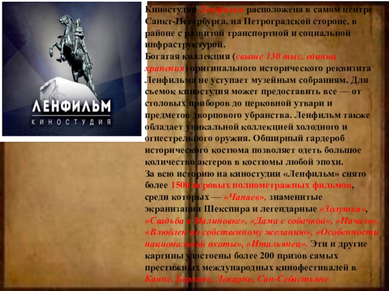 Слайд 26Киностудия Ленфильм расположена в самом центре Санкт-Петербурга, на Петроградской стороне, в