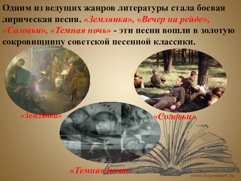 Слайд 31Одним из ведущих жанров литературы стала боевая лирическая песня. «Землянка», «Вечер на