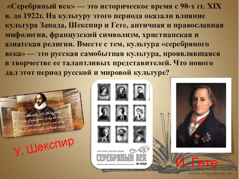 в. до 1922г. На культуру этого периода оказали влияние культура Запада, Шекспир и Гете, античная и православная мифология, французский символизм, христианская и азиатская религии. Вместе с тем, культура «серебряного века» — это русская самобытная культура, проявлявшаяся в творчестве ее талантливых представителей. Что нового дал этот период русской и мировой культуре?
