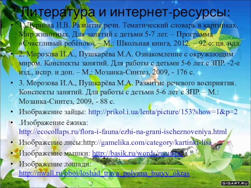 3. Морозова И.А., Пушкарёва М.А. Развитие речевого восприятия. Конспекты занятий. Для работы с детьми 5-6 лет с ЗПР. – М.: Мозаика-Синтез, 2009, - 88 с.