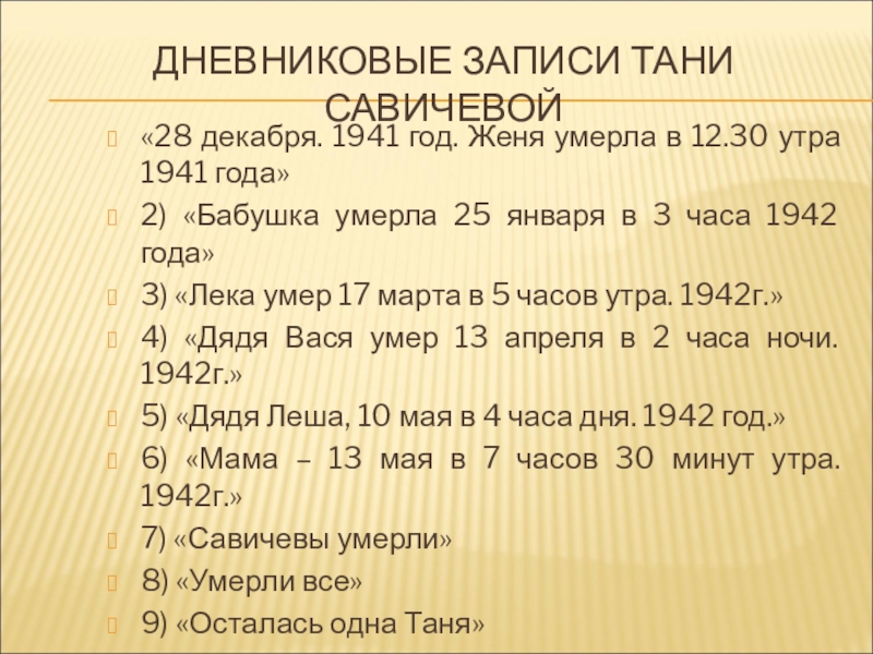 ДНЕВНИКОВЫЕ ЗАПИСИ ТАНИ САВИЧЕВОЙ«28 декабря. 1941 год. Женя умерла в 12.30 утра 1941 года»2) «Бабушка умерла 25