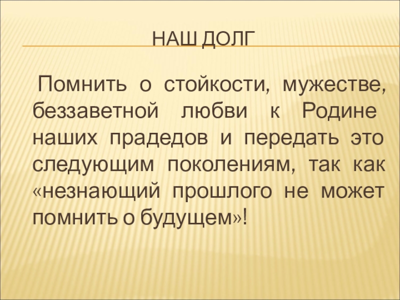 НАШ ДОЛГ Помнить о стойкости, мужестве, беззаветной любви к Родине наших прадедов и передать это следующим поколениям,