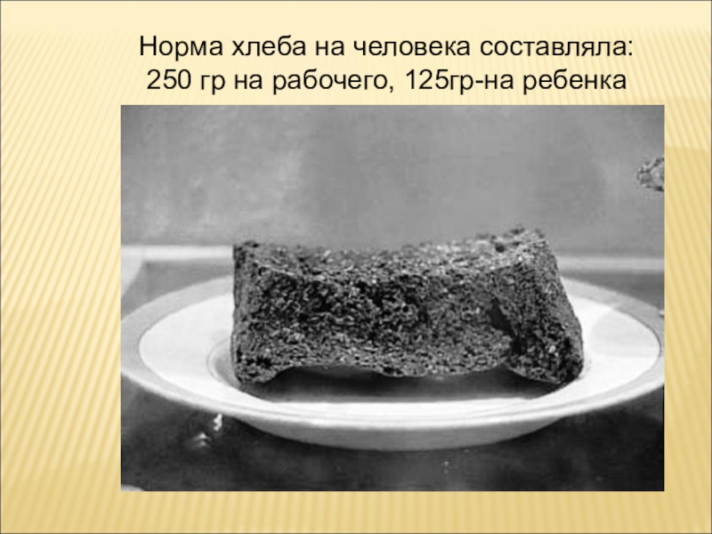 Норма хлеба на человека составляла: 250 гр на рабочего, 125гр-на ребенка