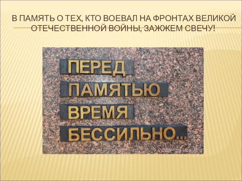 Слайд 14В ПАМЯТЬ О ТЕХ, КТО ВОЕВАЛ НА ФРОНТАХ ВЕЛИКОЙ ОТЕЧЕСТВЕННОЙ ВОЙНЫ,