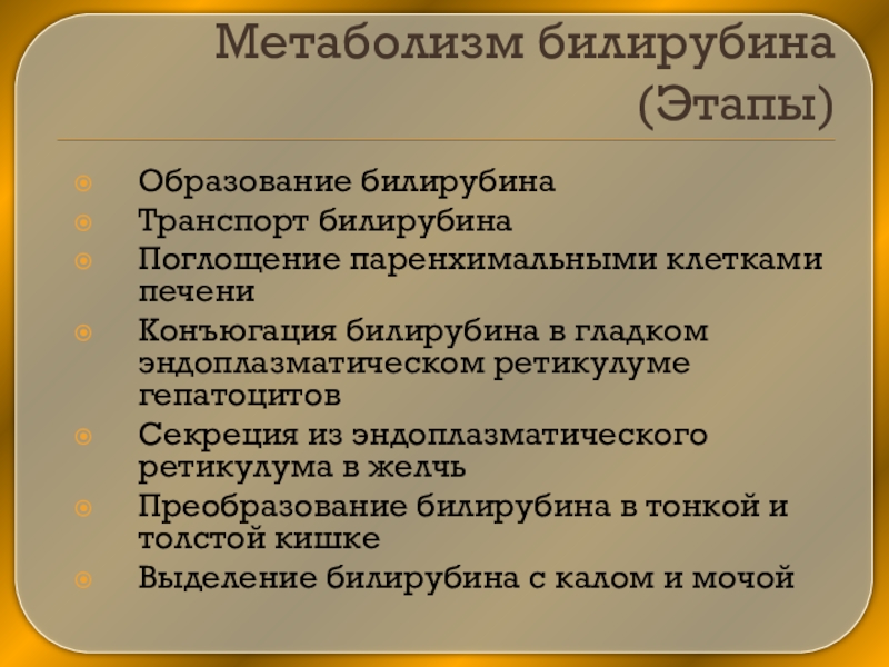 Метаболизм билирубина (Этапы)Образование билирубинаТранспорт билирубинаПоглощение паренхимальными клетками печениКонъюгация билирубина в гладком эндоплазматическом ретикулуме гепатоцитовСекреция из эндоплазматического ретикулума