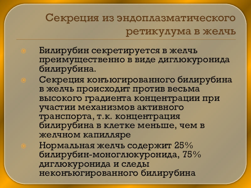 Секреция из эндоплазматического ретикулума в желчьБилирубин секретируется в желчь преимущественно в виде диглюкуронида билирубина. Секреция конъюгированного билирубина