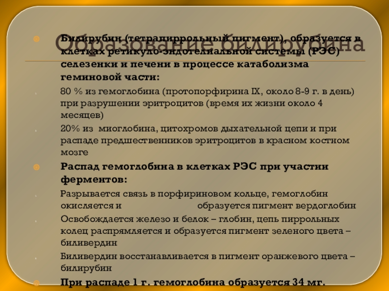 Образование билирубинаБилирубин (тетрапиррольный пигмент), образуется в клетках ретикуло-эндотелиальной системы (РЭС) селезенки и печени в процессе катаболизма геминовой