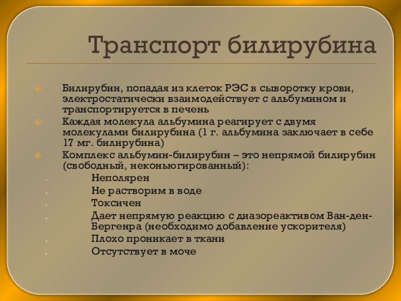 Транспорт билирубинаБилирубин, попадая из клеток РЭС в сыворотку крови, электростатически взаимодействует с альбумином и транспортируется в печеньКаждая