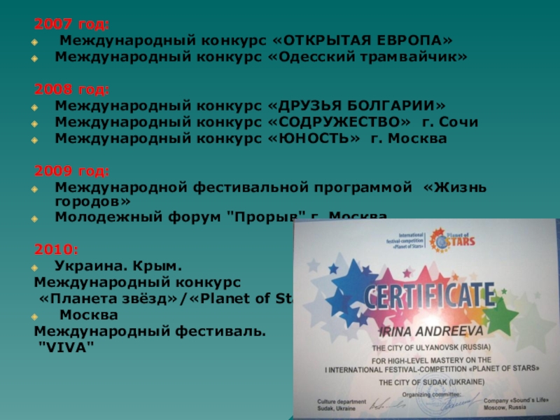 2007 год: Международный конкурс «ОТКРЫТАЯ ЕВРОПА» Международный конкурс «Одесский трамвайчик» 2008 год:Международный конкурс «ДРУЗЬЯ БОЛГАРИИ» Международный конкурс