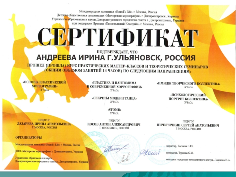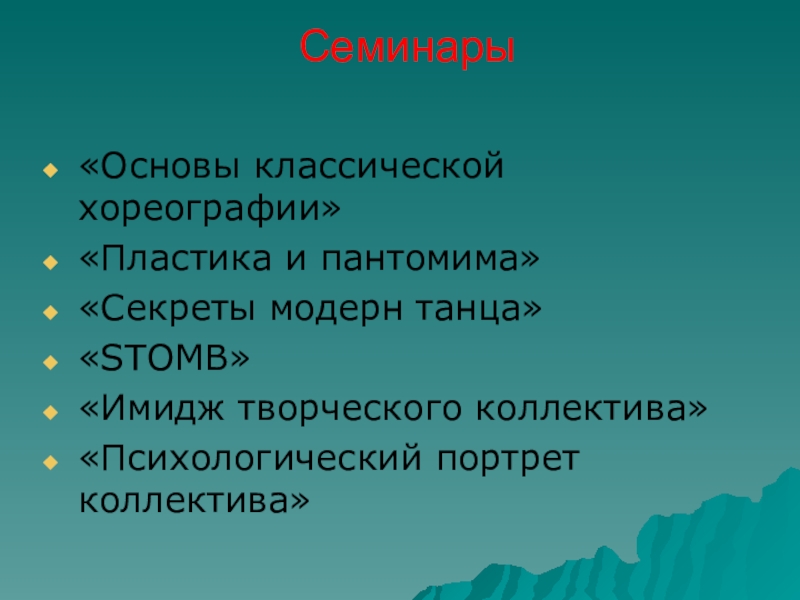 Семинары «Основы классической хореографии»«Пластика и пантомима»«Секреты модерн танца»«STOMB»«Имидж творческого коллектива»«Психологический портрет коллектива»