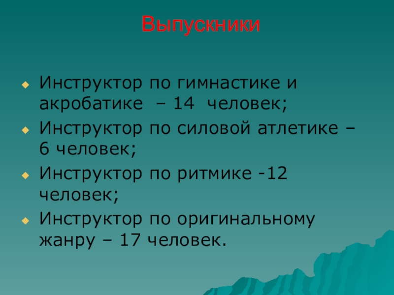 Выпускники Инструктор по гимнастике и акробатике – 14 человек;Инструктор по силовой атлетике – 6 человек;Инструктор по ритмике