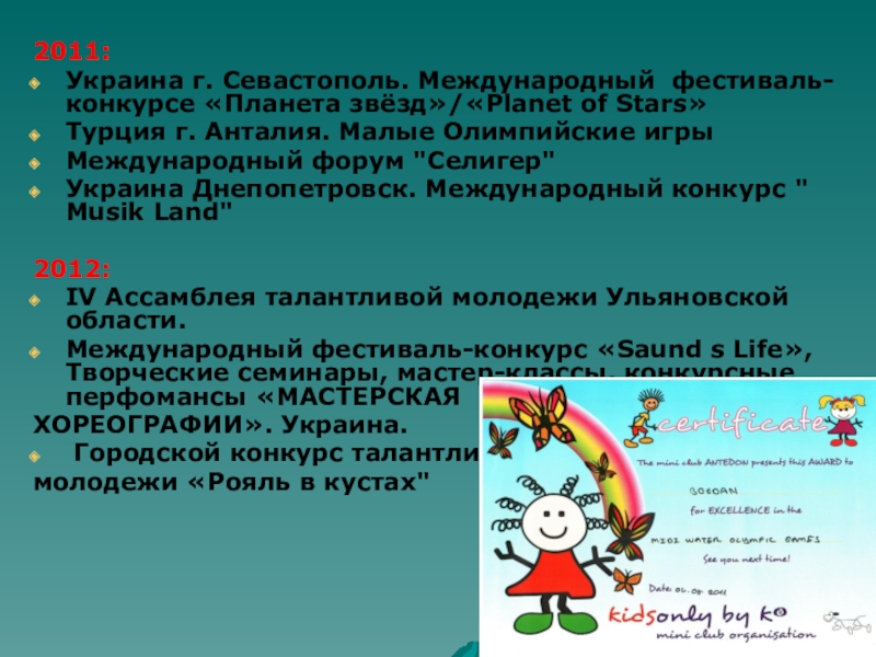 2011:Украина г. Севастополь. Международный фестиваль-конкурсе «Планета звёзд»/«Planet of Stars» Турция г. Анталия. Малые Олимпийские игры Международный форум