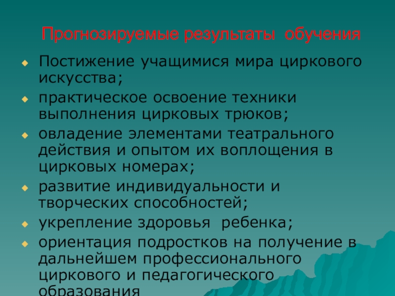 Прогнозируемые результаты обучения Постижение учащимися мира циркового искусства; практическое освоение техники выполнения цирковых трюков;овладение элементами театрального действия